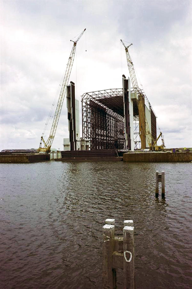 Het stalen liftplatform van 76 bij 15 meter kan schepen tot 2500 ton heffen en is